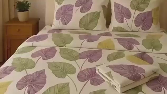 This set features a refreshing mix of lush tropical leaves in muted greens, mustard, and mauve, laid over a soft ivory base. Paired with a reversible solid peach backing, the look is both serene and sophisticated. Designed with 150 TC breathable fabric and plush microfiber filling, it promises a cozy yet lightweight feel perfect for any season.